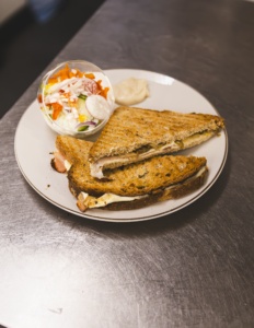 Gegrild brood met kaas en ham. Geserveerd met een slaatje. Eventueel ook verkrijgbaar met alleen kaas/ham.