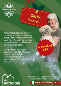 Na een loopbaan van meer dan 40 jaar in het onderwijs heeft Gerty de tijd gevonden voor haar hobby’s en passies: van schilderen tot keramiek en natuurlijk lezen. Gerty neemt de jonge bezoekers van Wintermagie mee op wonderlijke winteravonturen op woensdagen telkens om 15 uur.