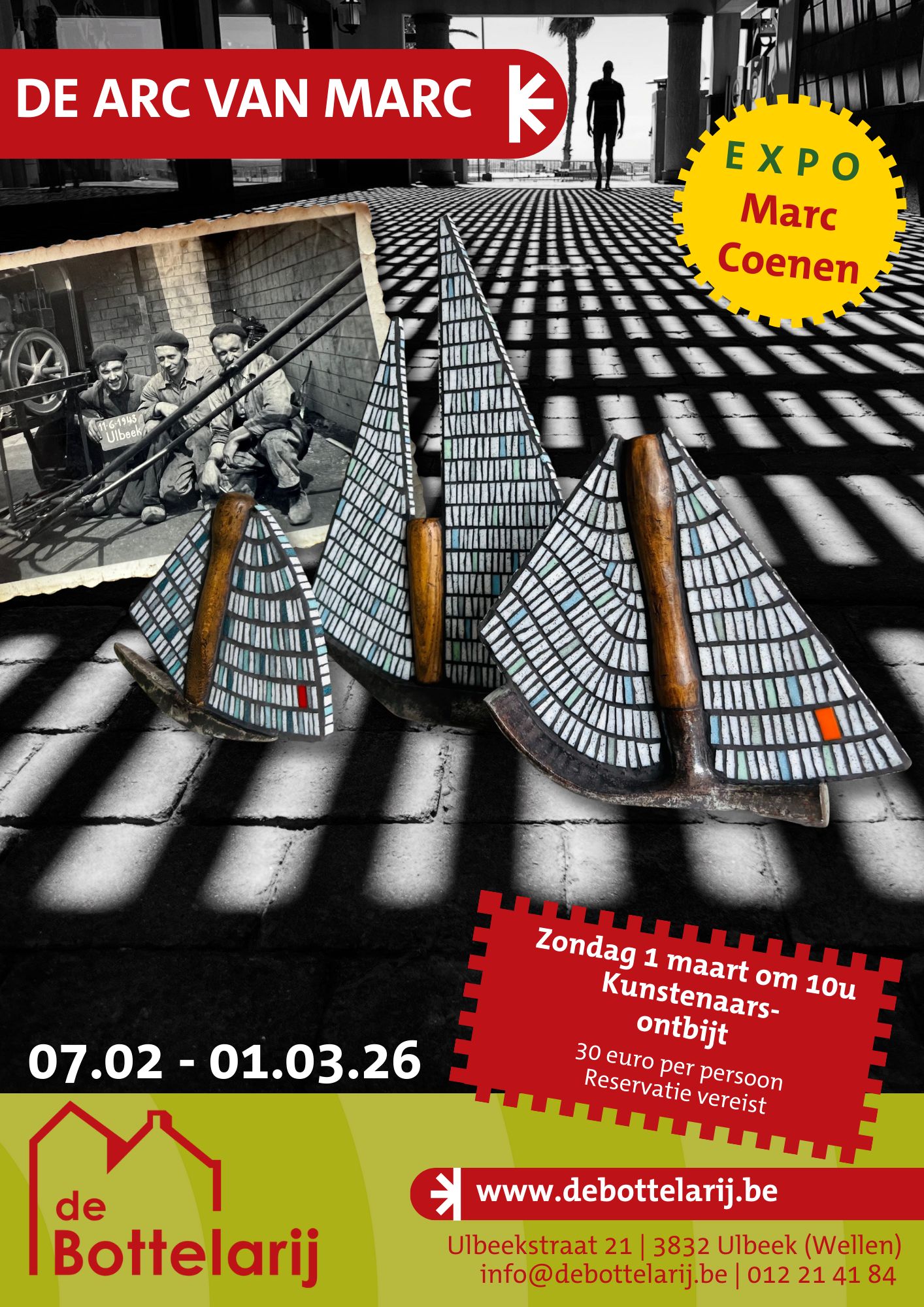 Galerie Ulbeekstraat 21, Ulbeek, Limburg, BelgiëDe expo De Arc van Marc brengt het fotografisch erfgoed van Jules Coenen in dialoog met de kleurrijke mozaïekkunst van zijn zoon Marc, geïnspireerd door ambacht, religieuze symboliek en persoonlijke herinneringen. Deze unieke tentoonstelling verbindt verleden en heden via foto’s, objecten en mozaïeken die ritme, vorm en emotie centraal zetten.